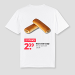 Twee klassieke worstenbroodjes, knapperig en goudbruin, met zo’n typische prijssticker die iedereen herkent van een impulsieve koop bij de appie. Het heeft dezelfde energie als: “Ik pak dit even snel mee want ik heb nu honger, niet later.” Het is simpel, droog en past perfect bij een studentikoze look.
