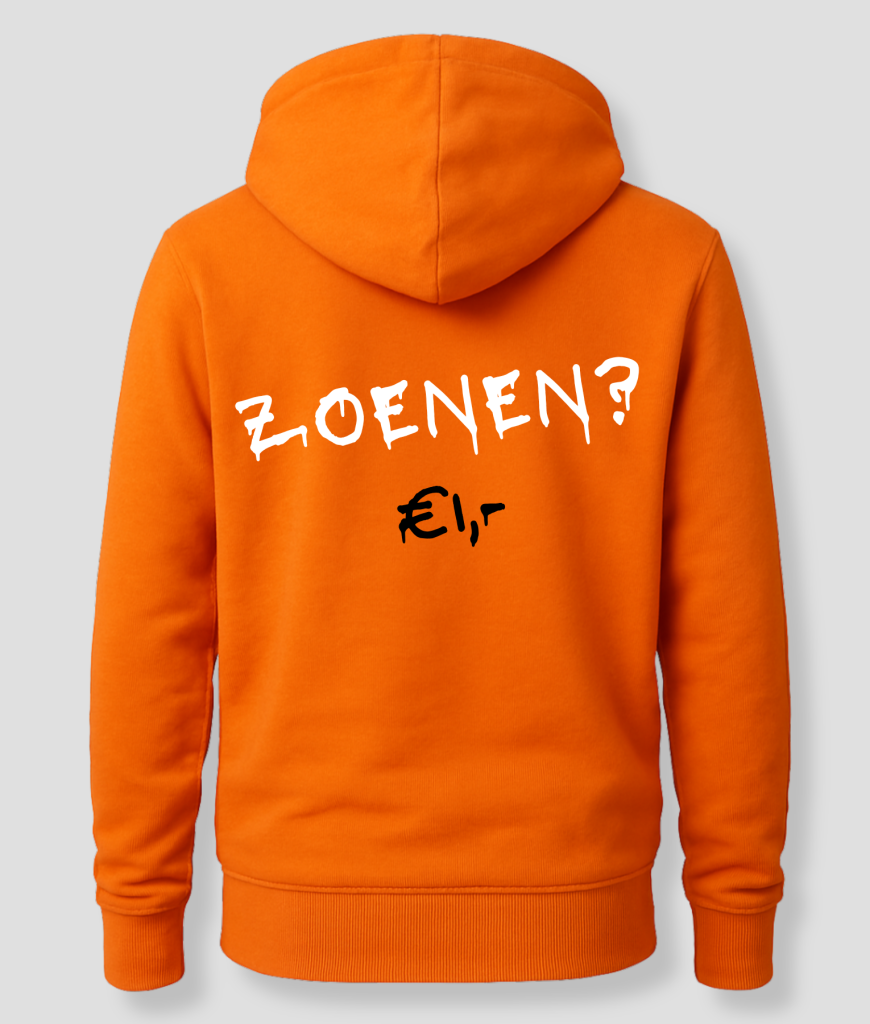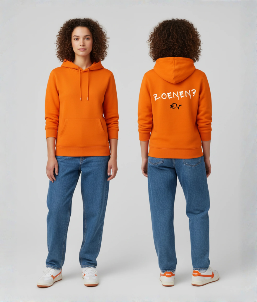 Zoenen? 1€ is de hoodie voor iedereen met lef (en misschien een beetje romantiek). Perfect voor Koningsdag of op een festival – draag ‘m met een knipoog en zie wie erop inhaakt