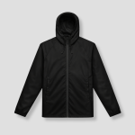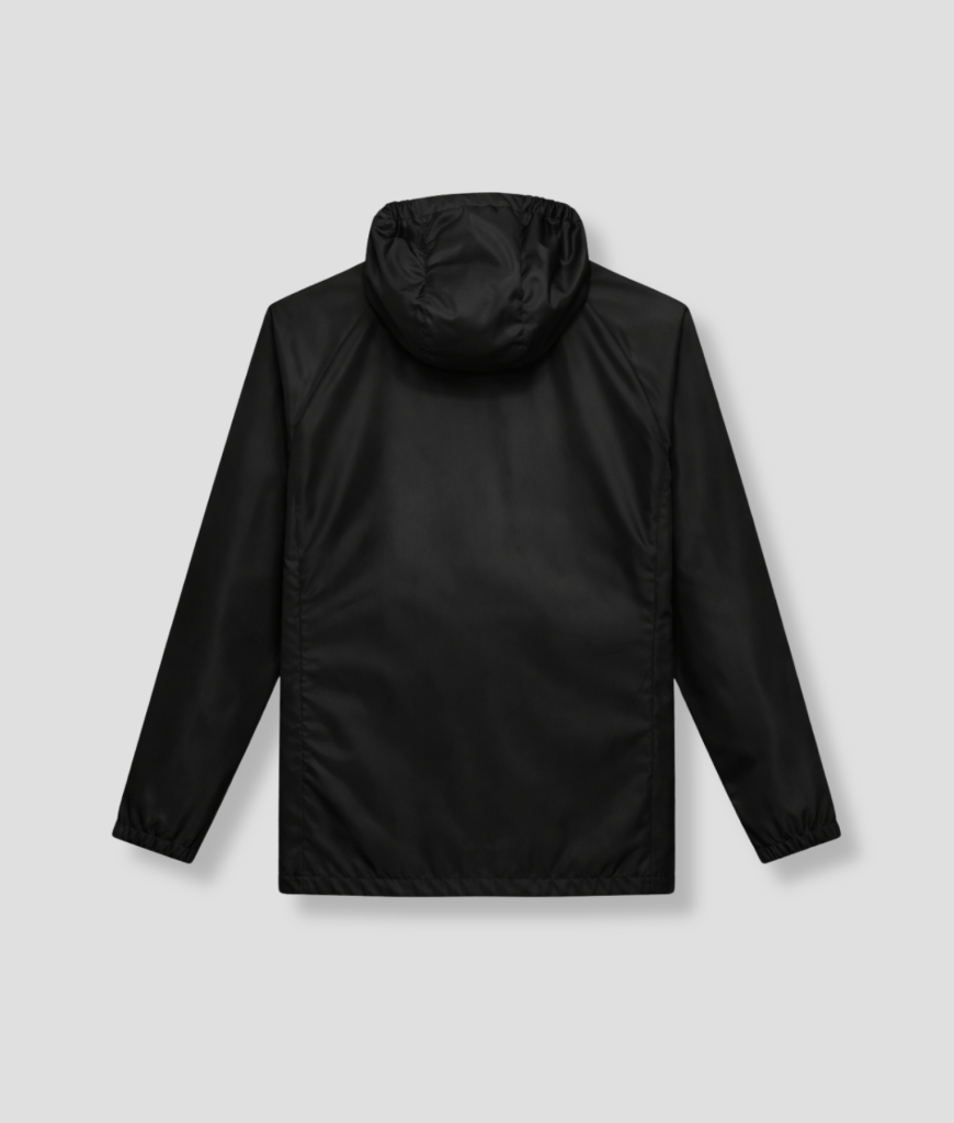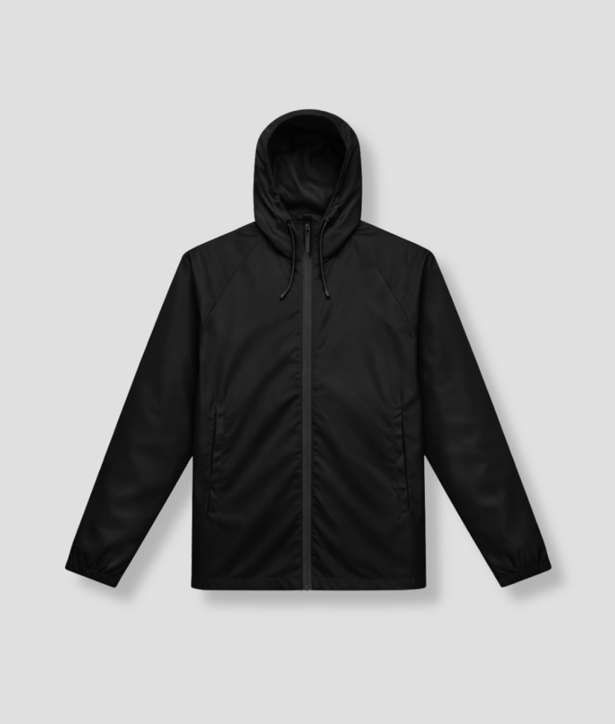 Je krijgt een lichtgewicht regenjas in het zwart. Voorzien van rits, capuchon en elastische manchetten zodat wind en regen minder kans krijgen.