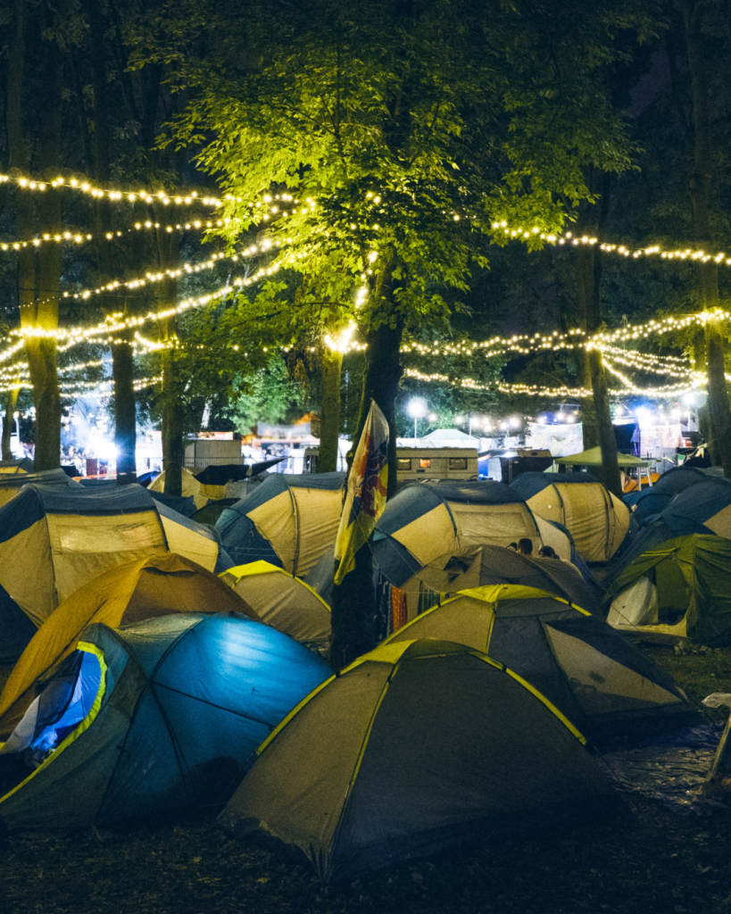 De festivalcamping is meestal het voordeligst. Deel een tent of leen er een. Vaak heeft iemand er toch eentje in de schuur liggen.